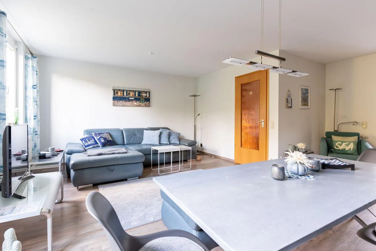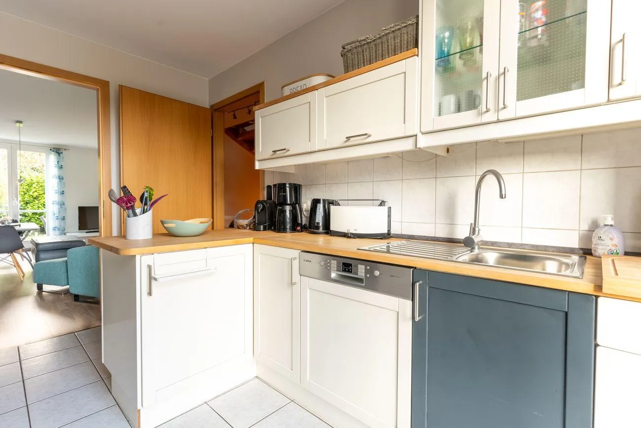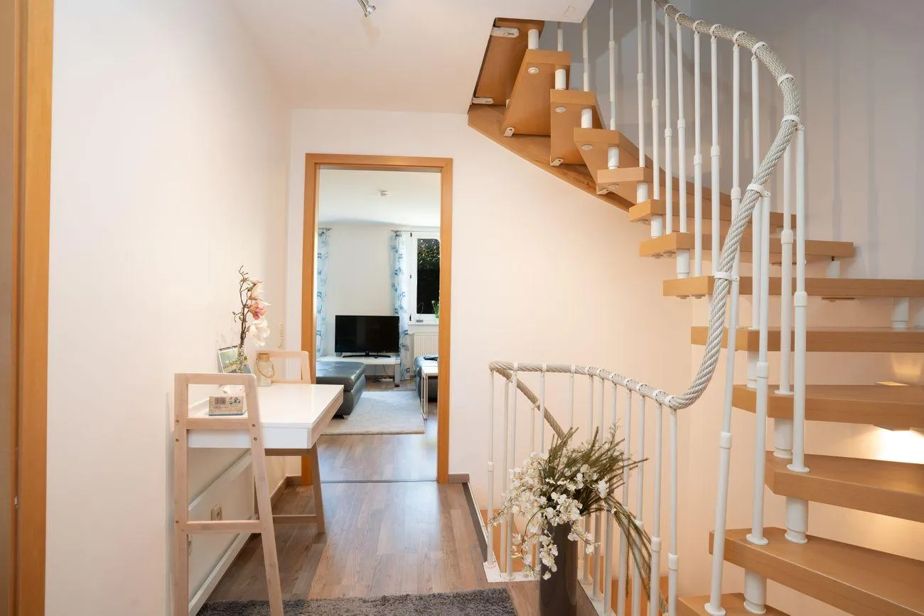 Im 1. Obergeschoss befindet sich der lichtdurchflutete Wohn- und Essbereich mit angrenzender, voll ausgestatteter Küche (inkl. Herd, Backofen, Kühlschrank, Geschirrspüler, Mikrowelle, Kaffeemaschine und Toaster). Ein Gäste-WC, ein gemütlicher Balkon sowie die Terrasse mit dem kleinen Garten bieten ideale Möglichkeiten zum Durchatmen – ob beim Frühstück an der frischen Luft oder einem Glas Wein am Abend.