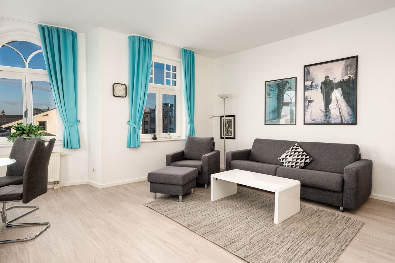 Das großzügig geschnittene 2 – Raum Apartment mit einer Größe von 68 qm groß ist für bis zu 4 Personen geeignet. Eine Aufbettung mit einem  Gästebett für eine weitere Person (Kind) ist möglich. Es besteht aus einem lichtdurchfluteten Wohn- Schlafraum, einem separaten Schlafzimmer, Küche, Balkon und einem Duschbad.