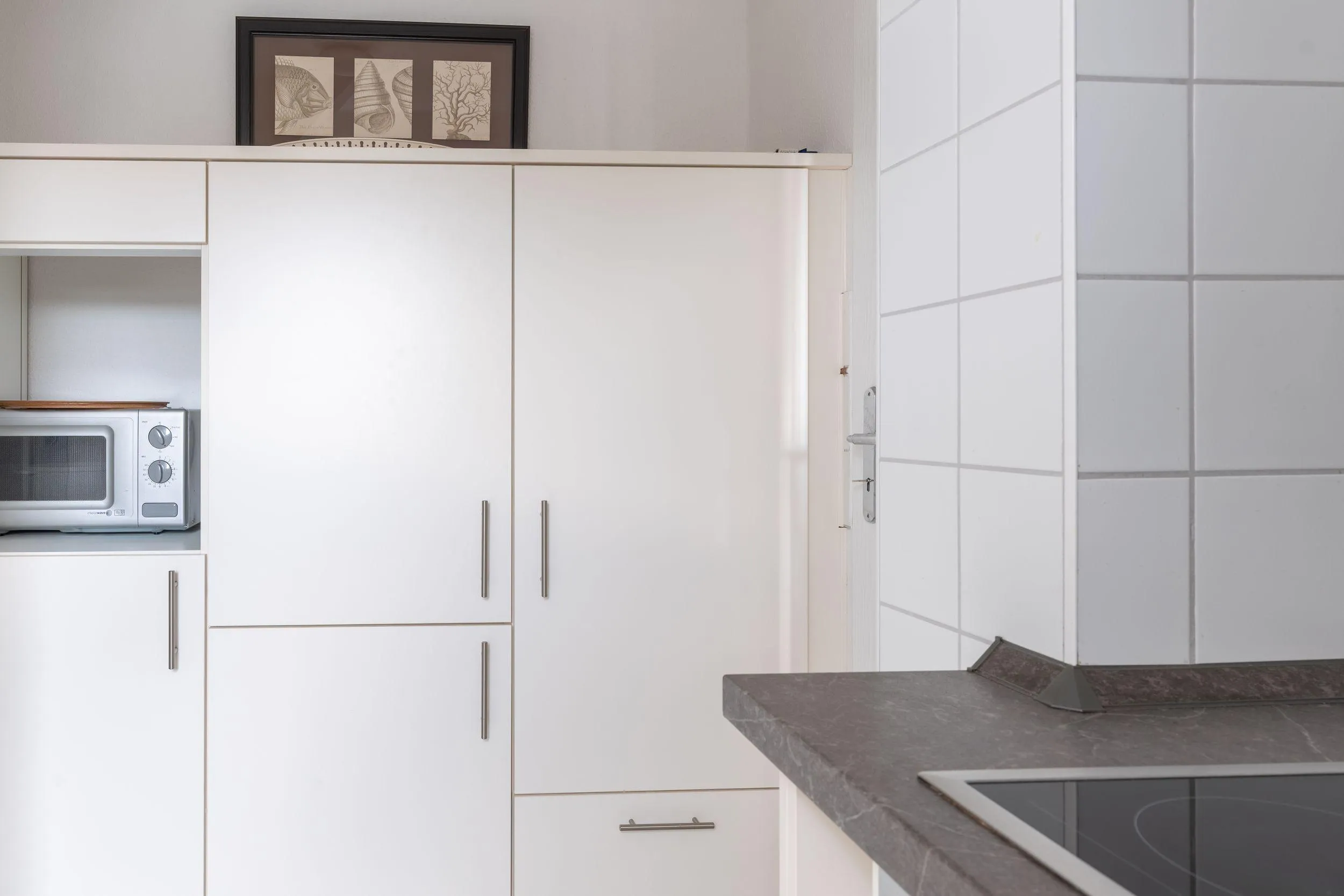 Die Küchenzeile ist mit einem Cerankochfeld mit 4 Platten, Backofen, Dunstabzugshaube, Mikrowelle, Kühlschrank, Geschirrspüler, Elektrogeräten wie Kaffeemaschine, Toaster, Wasserkocher und natürlich mit allem notwendigen Geschirr, Besteck und Gläser ausgestattet.