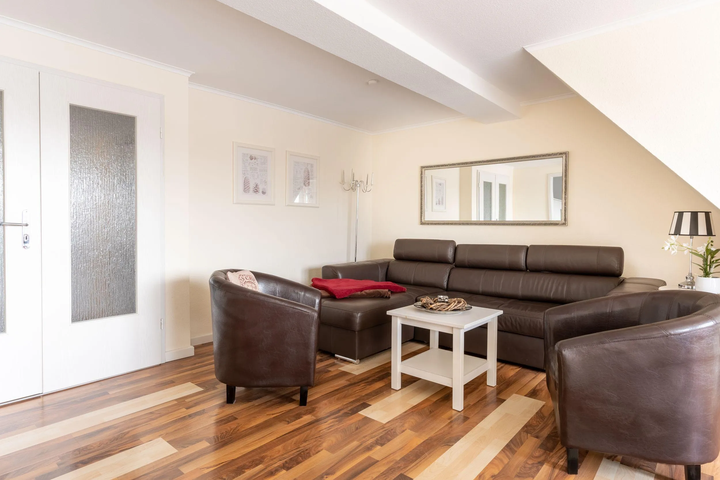 Die Couch im Wohnzimmer kann mit wenigen Handgriffen zum gemütlichen Schlafplatz für 2 weitere Personen umfunktioniert werden.