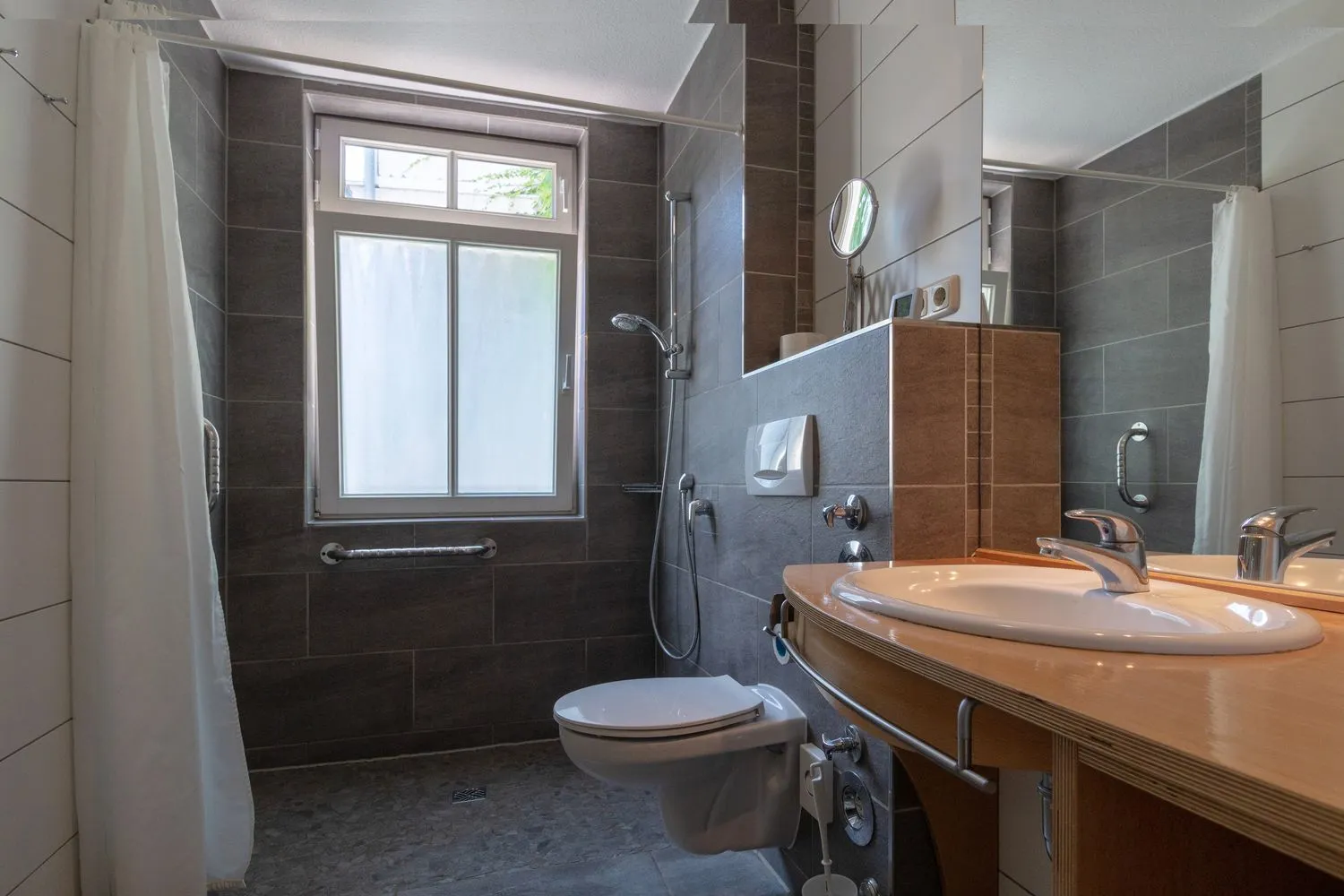 Das großzügig angelegte Bad mit Außenfenster verfügt über eine große bodentiefe Dusche mit Haltegriffen.