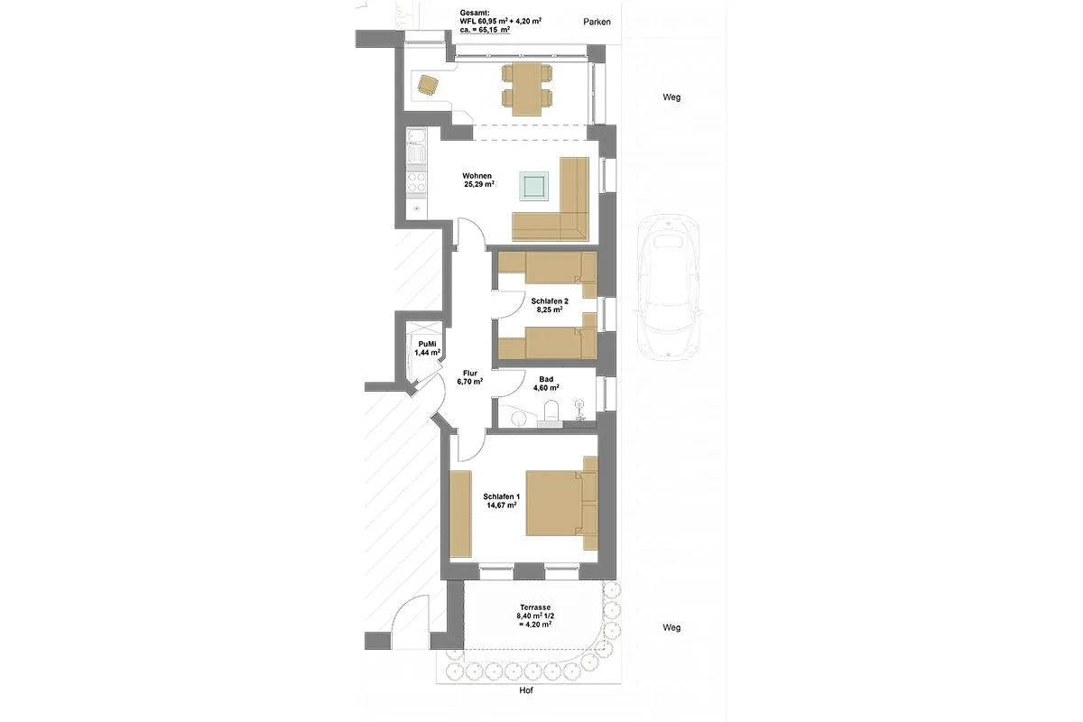 Unser freundliches 3-Zimmer Apartment Nr. 14 im Erdgeschoß bietet Platz für 4 Personen (zuzüglich Aufbettung für ein Kleinkind bis 2 Jahre).