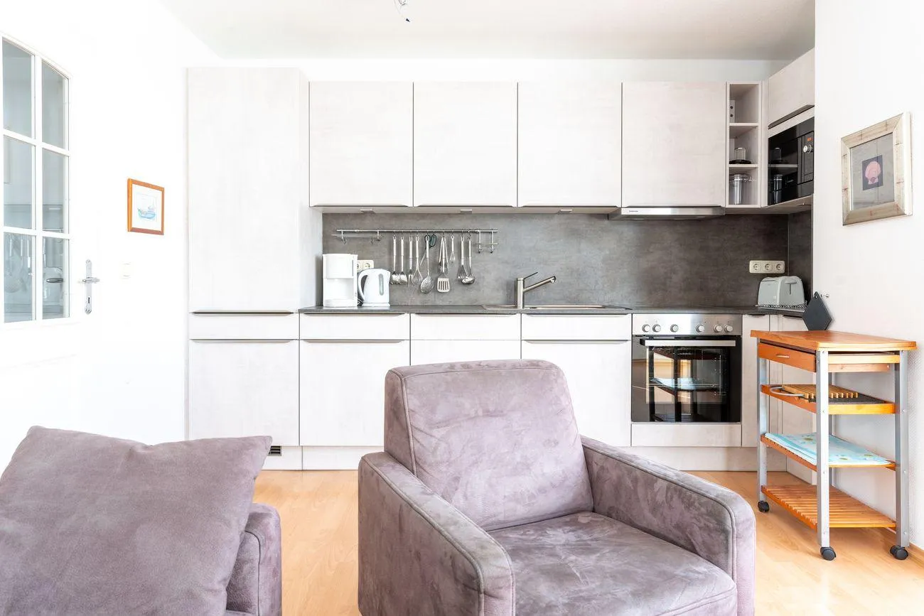 Die im Wohn/Essbereich integrierte offene Küche lässt keine Wünsche offen und sorgt für Wohlfühl-Atmosphäre. Im Wohnbereich befindet sich eine gemütliche Couchecke mit TV sowie ein Essbereich. Neben Backofen, Geschirrspüler und Gefriermöglichkeit sind natürlich auch Gläser, Besteck und Elektrogeräte vorhanden.