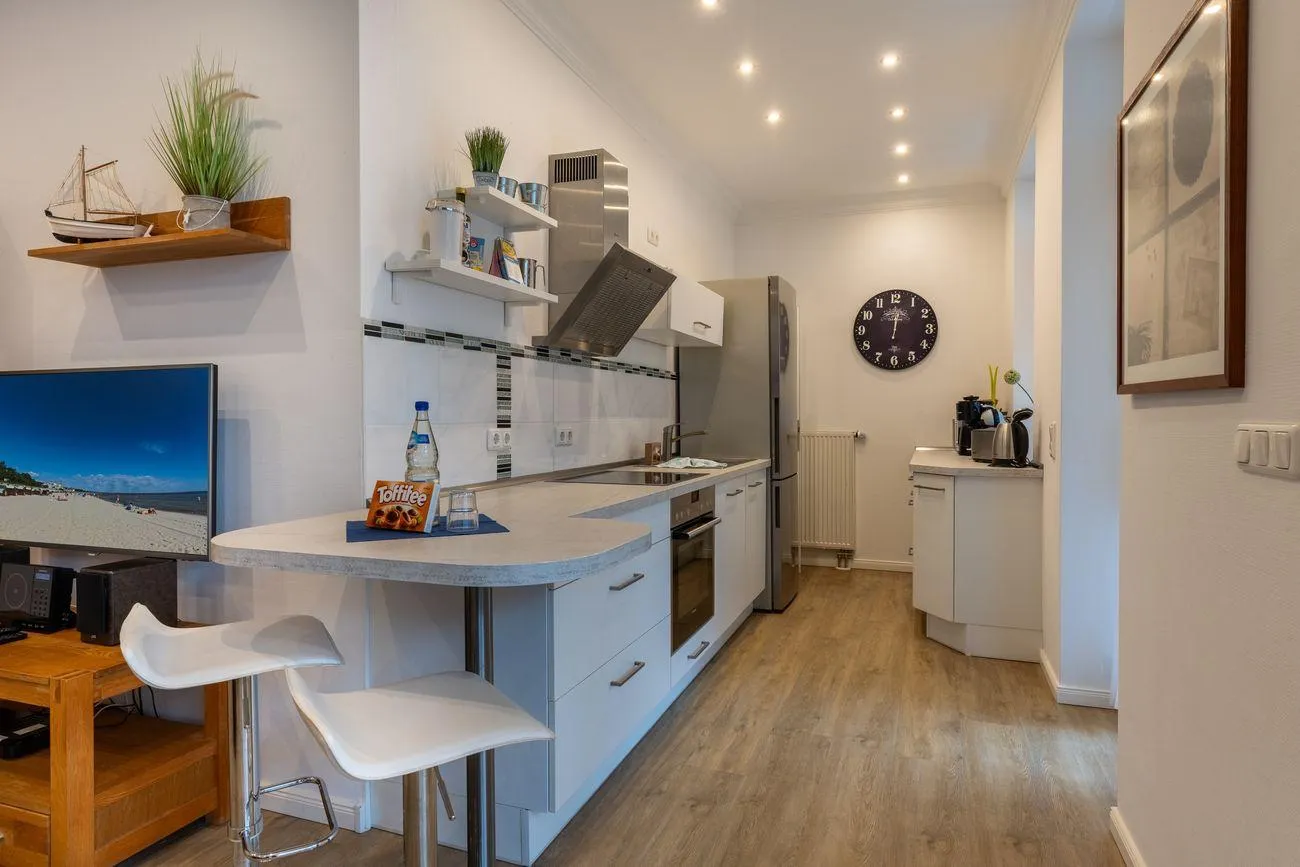 Unser 3- Raum Apartment bietet Ihnen gemütliche und moderne Wohnqualität. Die Ausstattung der Küche mit Espressomaschine, Mikrowelle, großer Kühl-/Gefrierkombination, Geschirr, Gläsern und weiteren Küchengeräten lässt keine Wünsche offen.