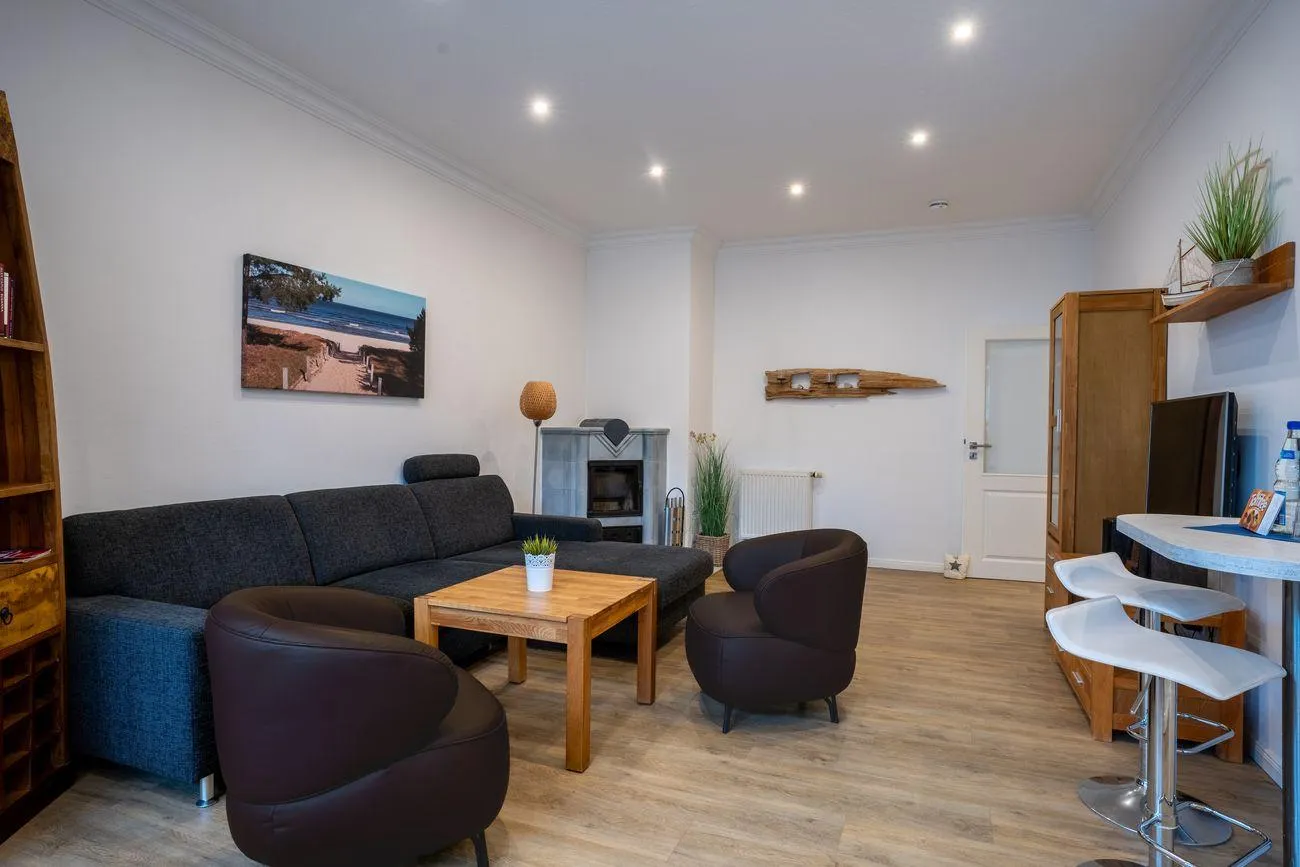 Im gemütlichen, mit Kamin ausgestatteten, Wohnzimmer ist eine zusätzliche Aufbettung auf dem Schlafsofa möglich. Der Wohnbereich ist zusätzlich ausgestattet mit TV, Blue-Ray Player und einer Stereoanlage.