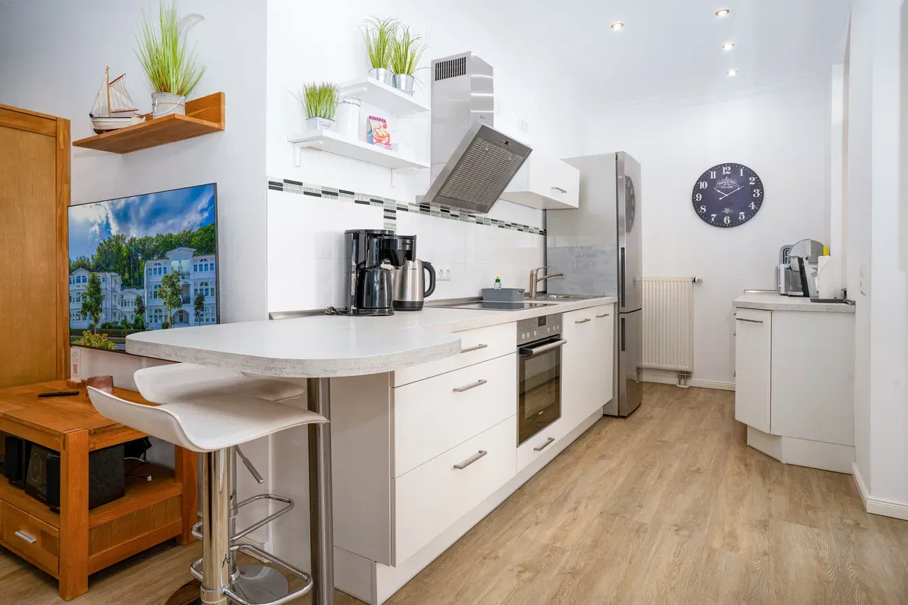 Unser 3- Raum Apartment bietet Ihnen gemütliche und moderne Wohnqualität. Die Ausstattung der Küche mit Espressomaschine, Mikrowelle, großer Kühl-/Gefrierkombination, Geschirr, Gläsern und weiteren Küchengeräten lässt keine Wünsche offen.