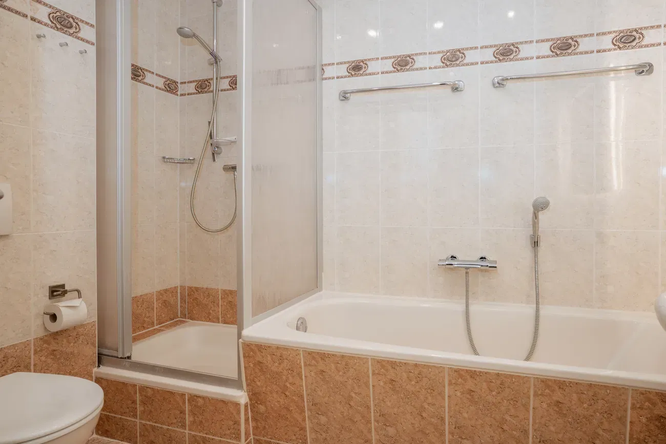 Das Bad ist mit Badewanne und Dusche ausgestattet. Ein zusätzliches Gäste – WC ist vorhanden.