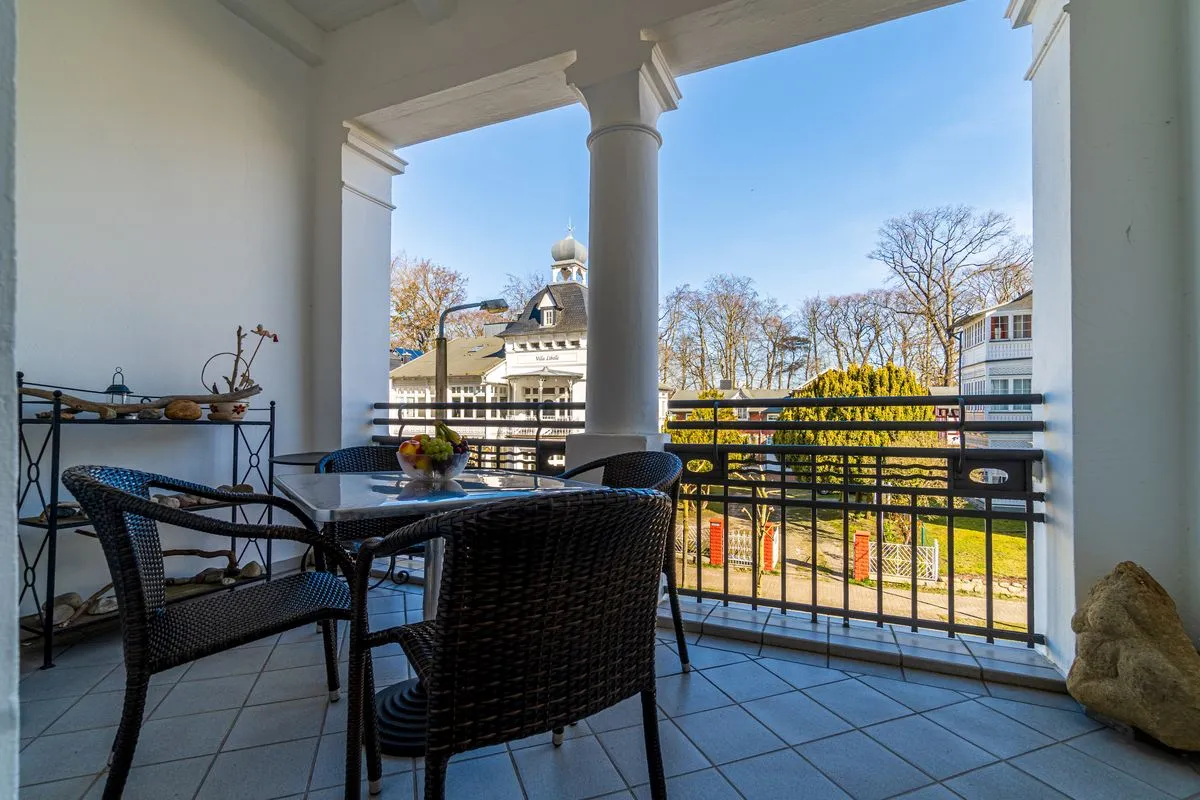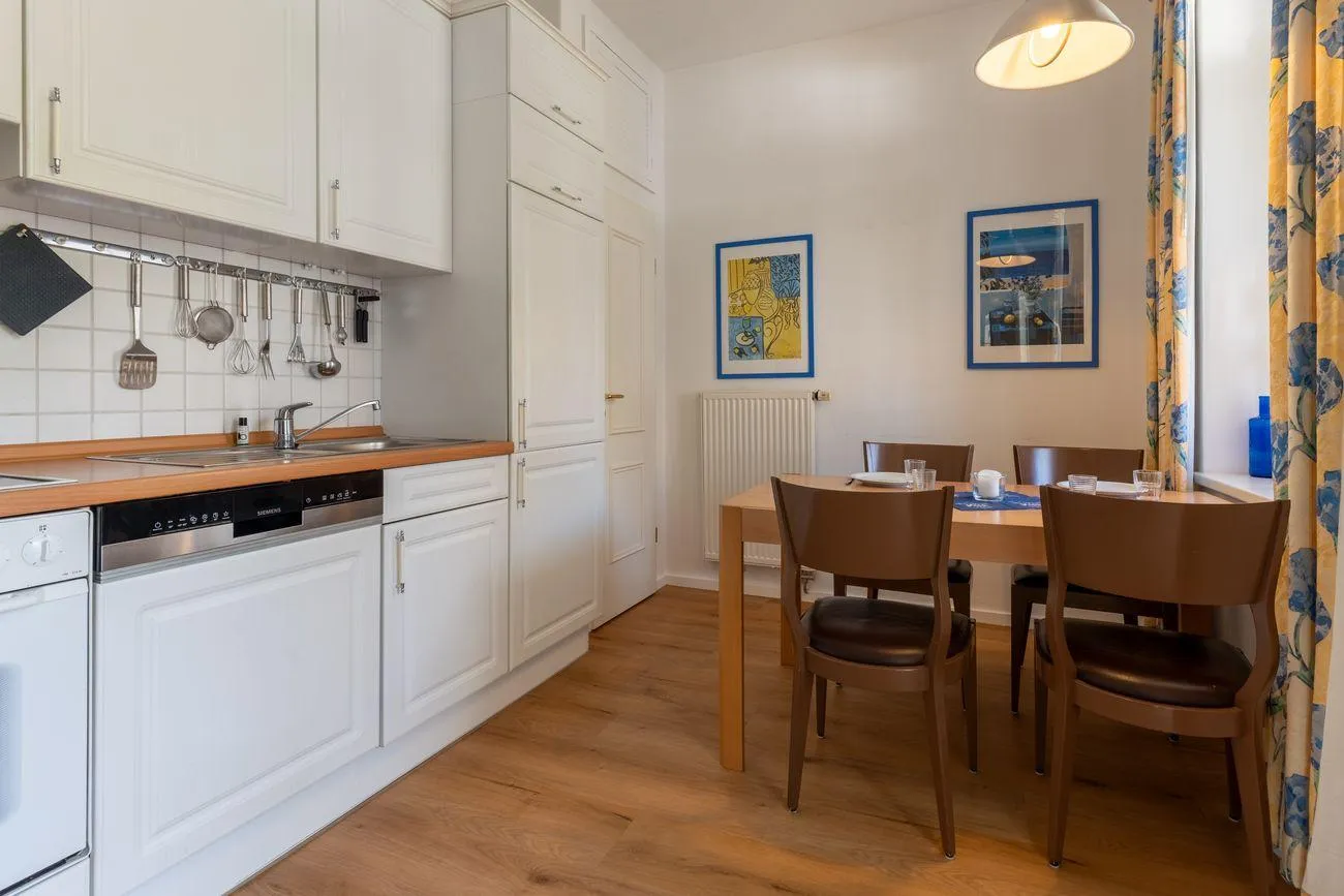 Der helle Wohnbereich auf der geschlossenen Veranda bietet Schlafmöglichkeiten für zwei weitere Personen und lädt mit Blick ins Grüne zum Verweilen ein. Die separate, voll ausgestattete Küche führt direkt auf den überdachten Balkon – ein herrlicher Ort für Ihr Frühstück oder ein Glas Wein am Abend. Abgerundet wird das Apartment durch ein stilvolles Bad mit Wanne – hier beginnt der Urlaub schon beim Ankommen.