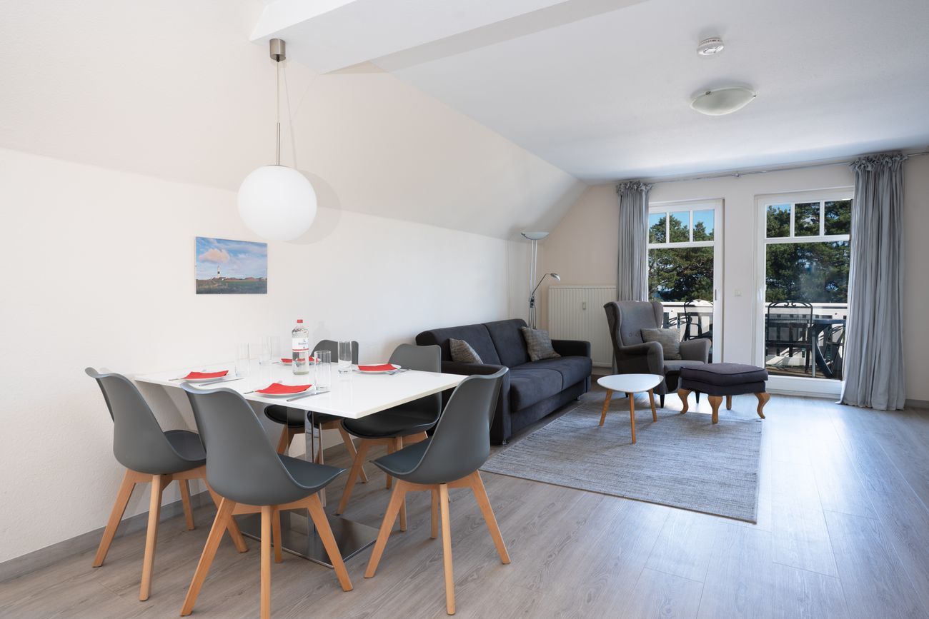 Im Wohn- und Essbereich befindet sich eine gemütliche Couch, die sich mit wenigen Handgriffen in eine komfortable Schlafgelegenheit für zwei Personen verwandeln lässt. Von hier aus haben Sie Zugang zum möblierten Balkon, der Ihnen einen wunderschönen Blick auf die Ostsee eröffnet – der perfekte Ort für den ersten Kaffee am Morgen oder ein Glas Wein bei Sonnenuntergang.