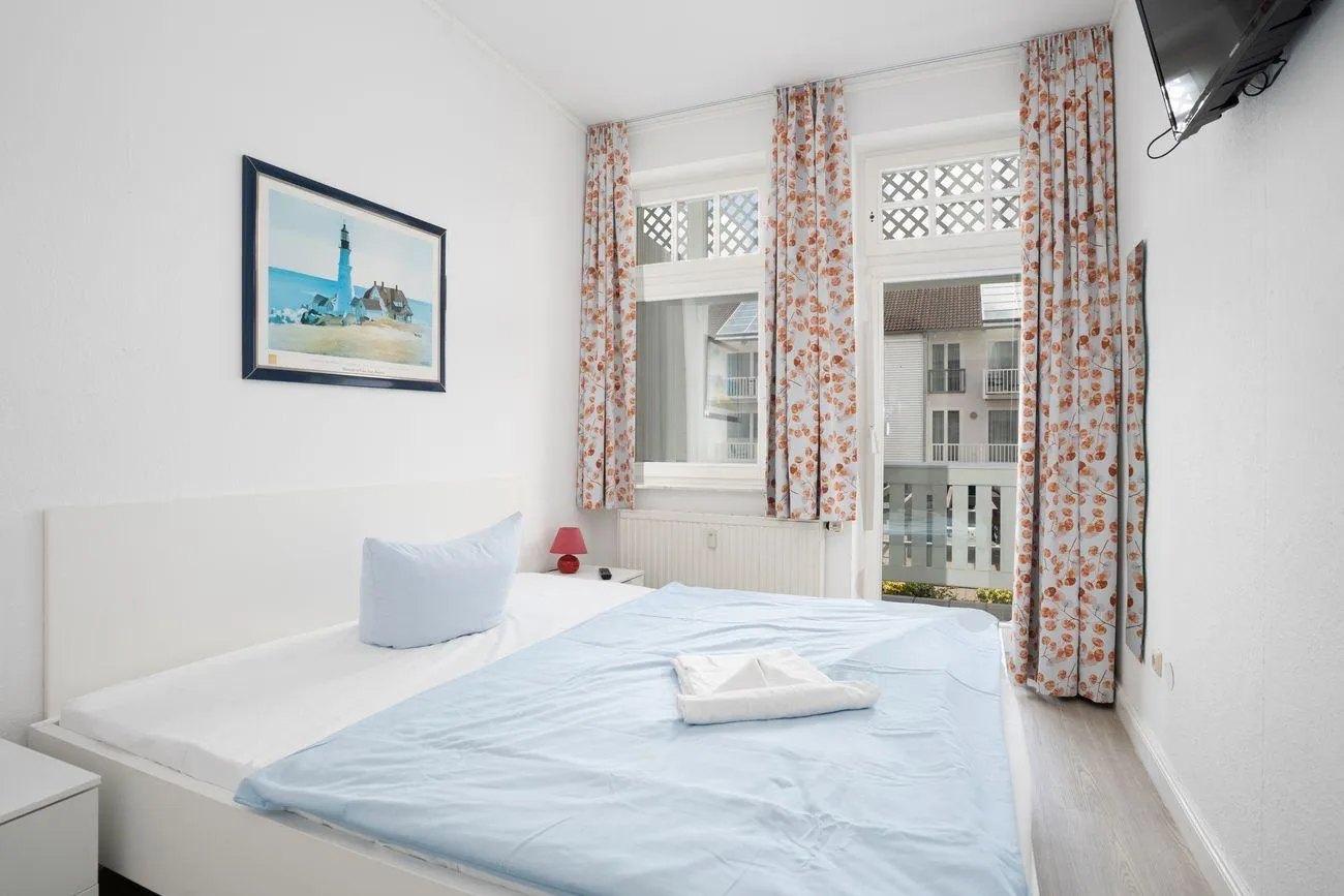 Im separaten Schlafzimmer finden Sie ein komfortables Doppelbett (1,80 m breit), einen geräumigen Kleiderschrank und einen eigenen Fernseher. Auch hier haben Sie Zugang zu einem kleinen Balkon – perfekt für einen ruhigen Start in den Tag mit frischer Meeresluft.