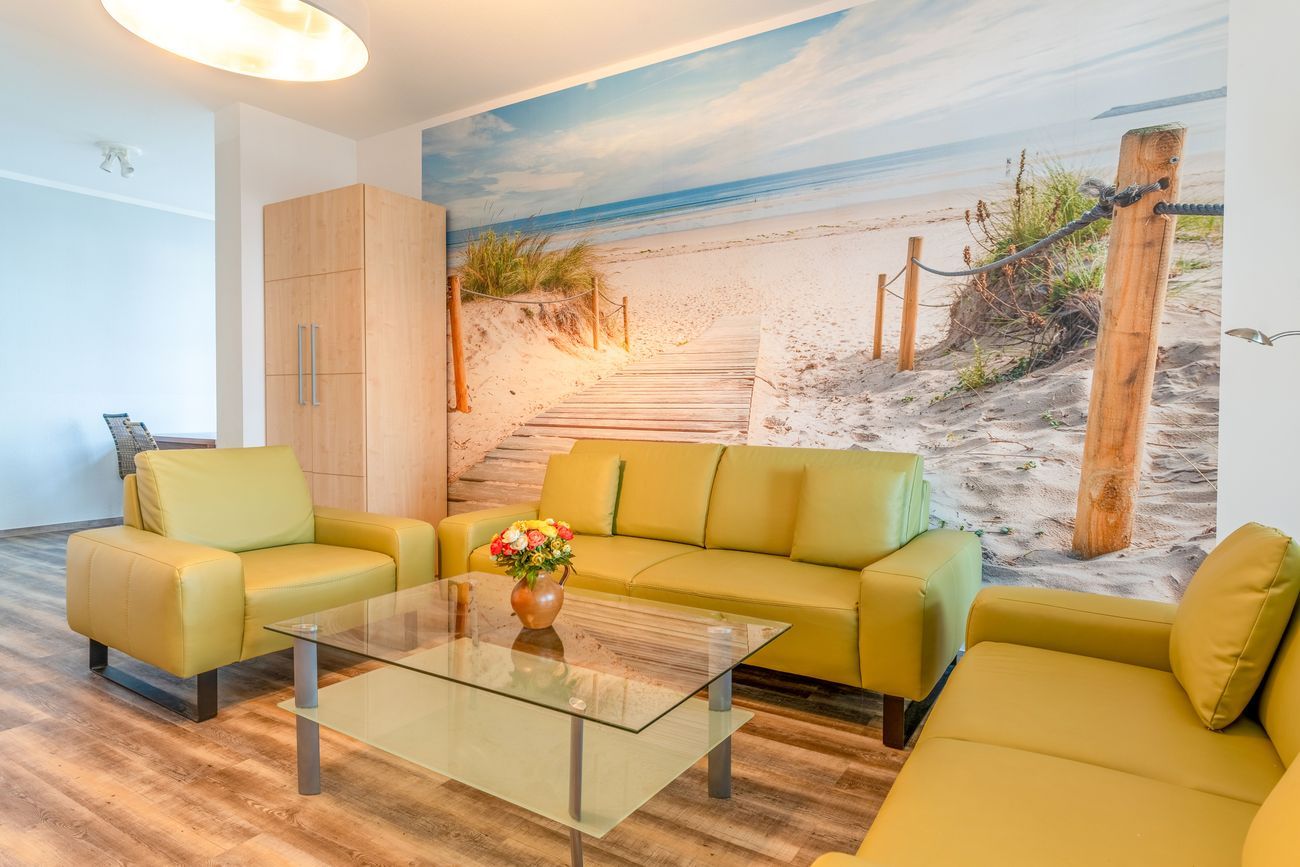 Das helle Wohnzimmer lädt mit einer gemütlichen Couch und einem modernen Flat-TV zu entspannten Stunden ein. Von hier aus gelangen Sie auf einen der beiden Balkone mit traumhaftem Blick auf die Ostsee – der perfekte Ort, um den Tag bei einer frischen Meeresbrise ausklingen zu lassen. Ein praktisches Schrankbett lässt sich im Handumdrehen in ein vollwertiges Doppelbett verwandeln.