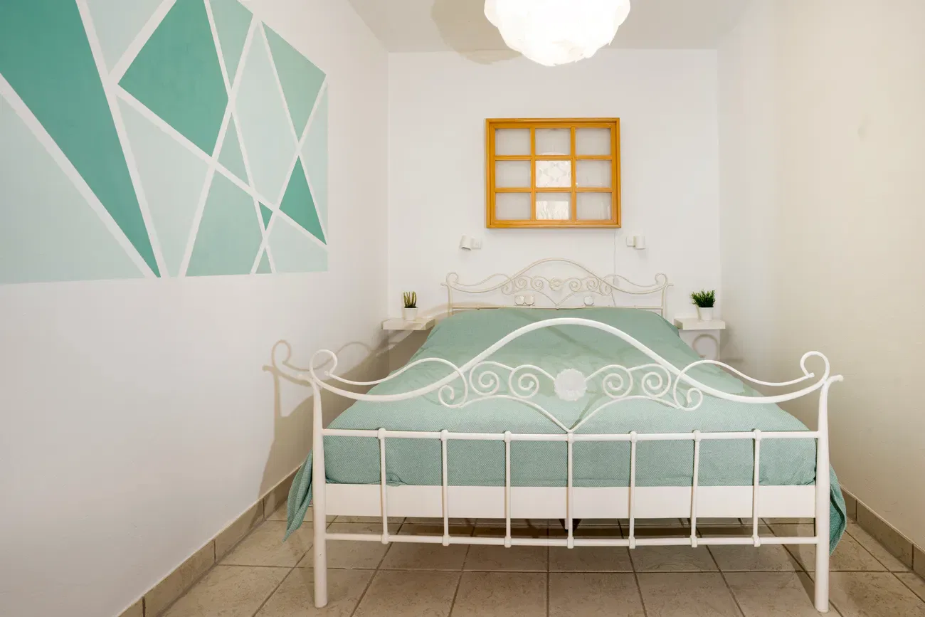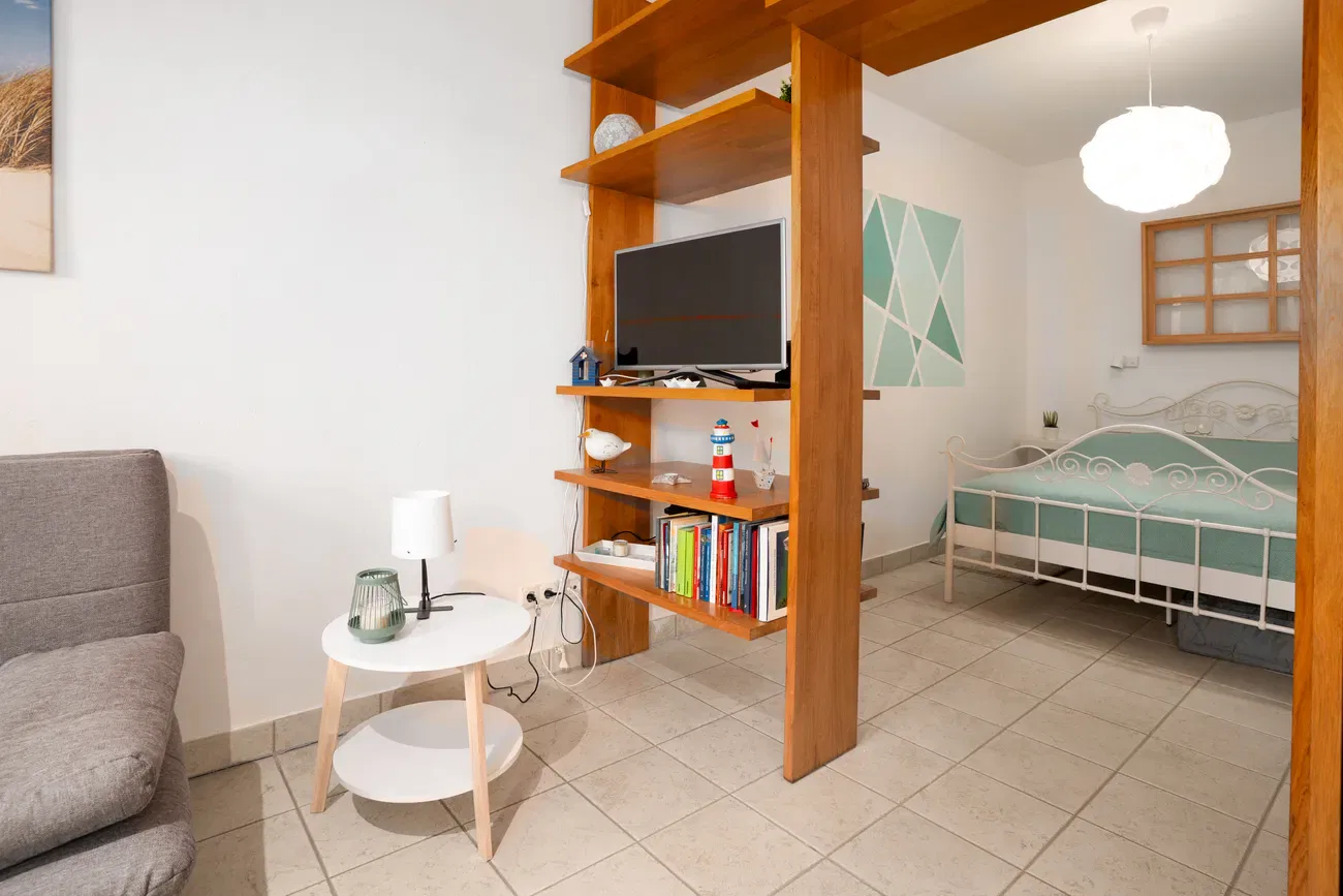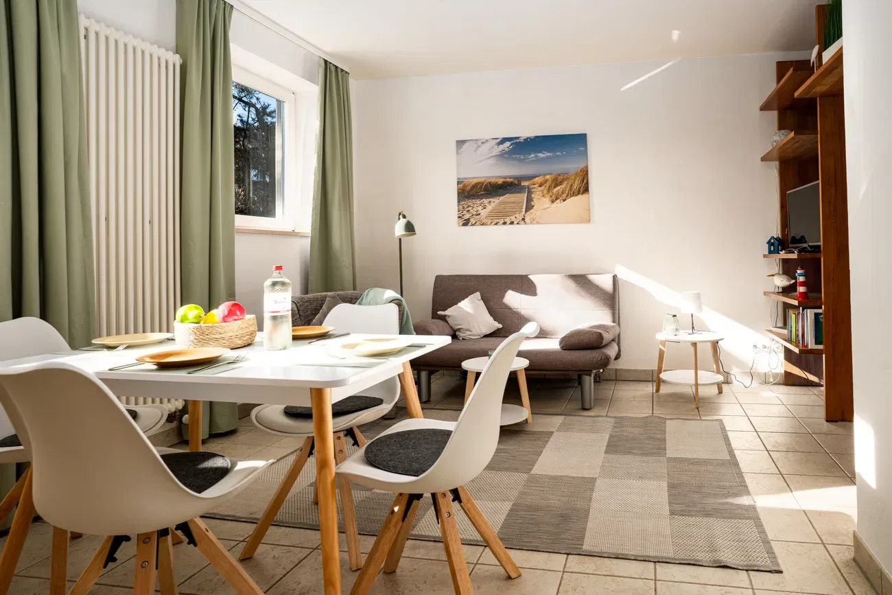 Die Fewo 1 Himmelblau empfängt Dich auf ca. 35 qm mit einem modernen und offen gestalteten Wohnkonzept. Das helle Studio ist ideal für bis zu 3 Personen zugeschnitten und überzeugt durch eine clevere Raumaufteilung: Ein stilvolles Regal dient als optischer Trenner und schafft eine gemütliche Privatsphäre für den Schlafbereich, ohne die Großzügigkeit des Raumes einzuschränken. Die integrierte Küchenzeile bietet alles für ein entspanntes Urlaubsfrühstück, das Du bei gutem Wetter auch im eigenen, kleinen Sitzbereich im Garten genießen kannst. Dank der Souterrain-Lage darfst Du Dich selbst im Hochsommer auf ein angenehm kühles und ruhiges Raumklima freuen.